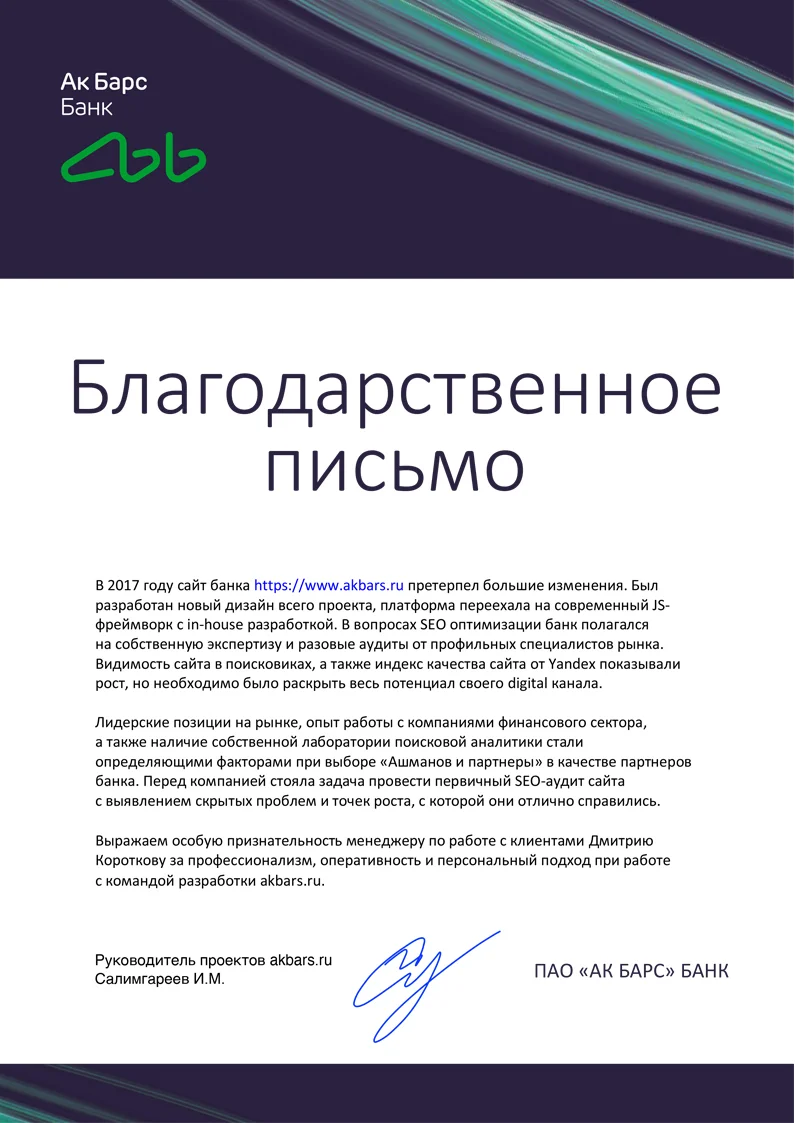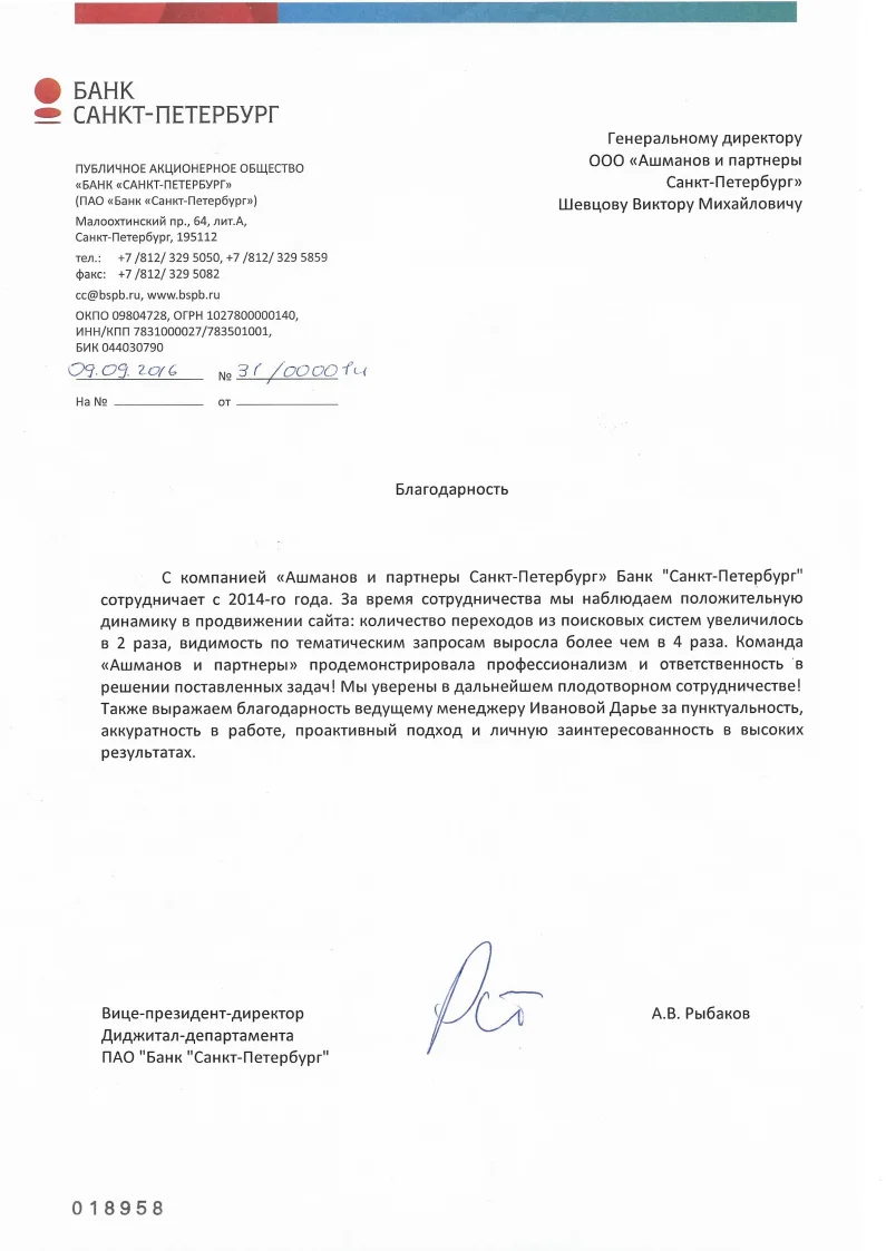 С компанией «Ашманов и партнеры Санкт-Петербург» Банк «Санкт-Петербург» сотрудничает с 2014 года. За время сотрудничества мы наблюдаем положительную динамику в продвижении сайта: количество переходов из поисковых систем увеличилось в 2 раза, видимость по тематическим запросам выросла более чем в 4 раза. Команда «Ашманов и партнеры» продемонстрировала профессионализм и ответственность в решении поставленных задач! Мы уверены в дальнейшем плодотворном сотрудничестве! Также выражаем благодарность ведущему менеджеру Ивановой Дарье за пунктуальность, аккуратность в работе, проактивных подход и личную заинтересованность в высоких результатах.