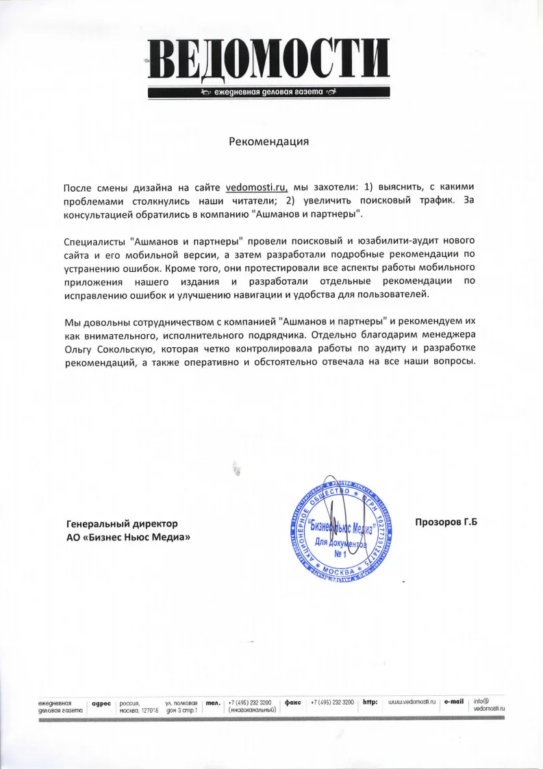 Можем рекомендовать компанию «Ашманов и партнеры» как надежного и высокопрофессионального партнера. Уровень предоставляемых услуг полностью соответствует высоким стандартам и требованиям нашей организации.