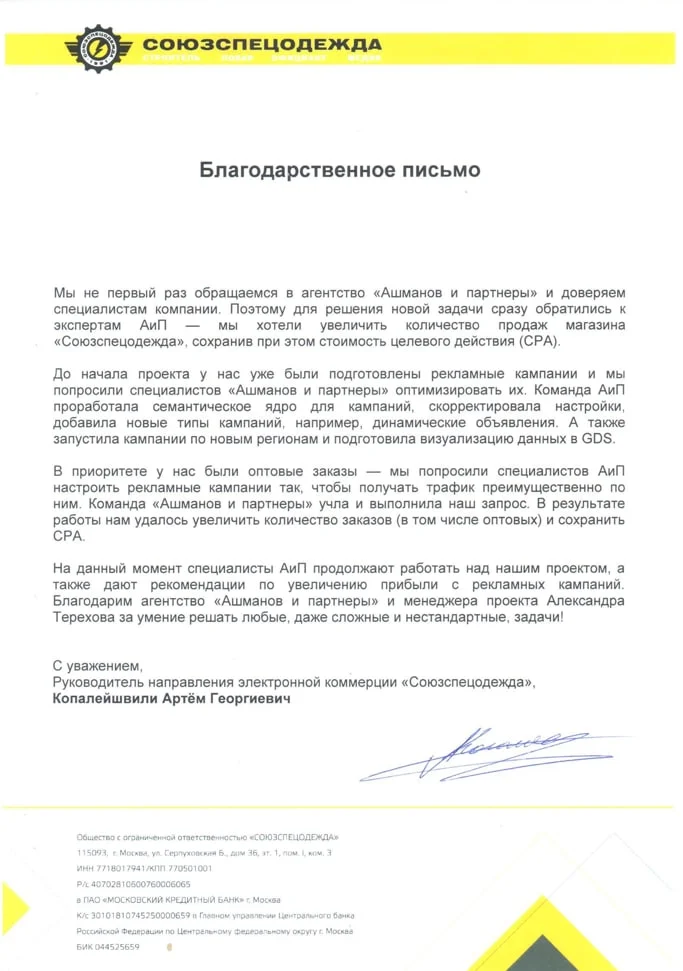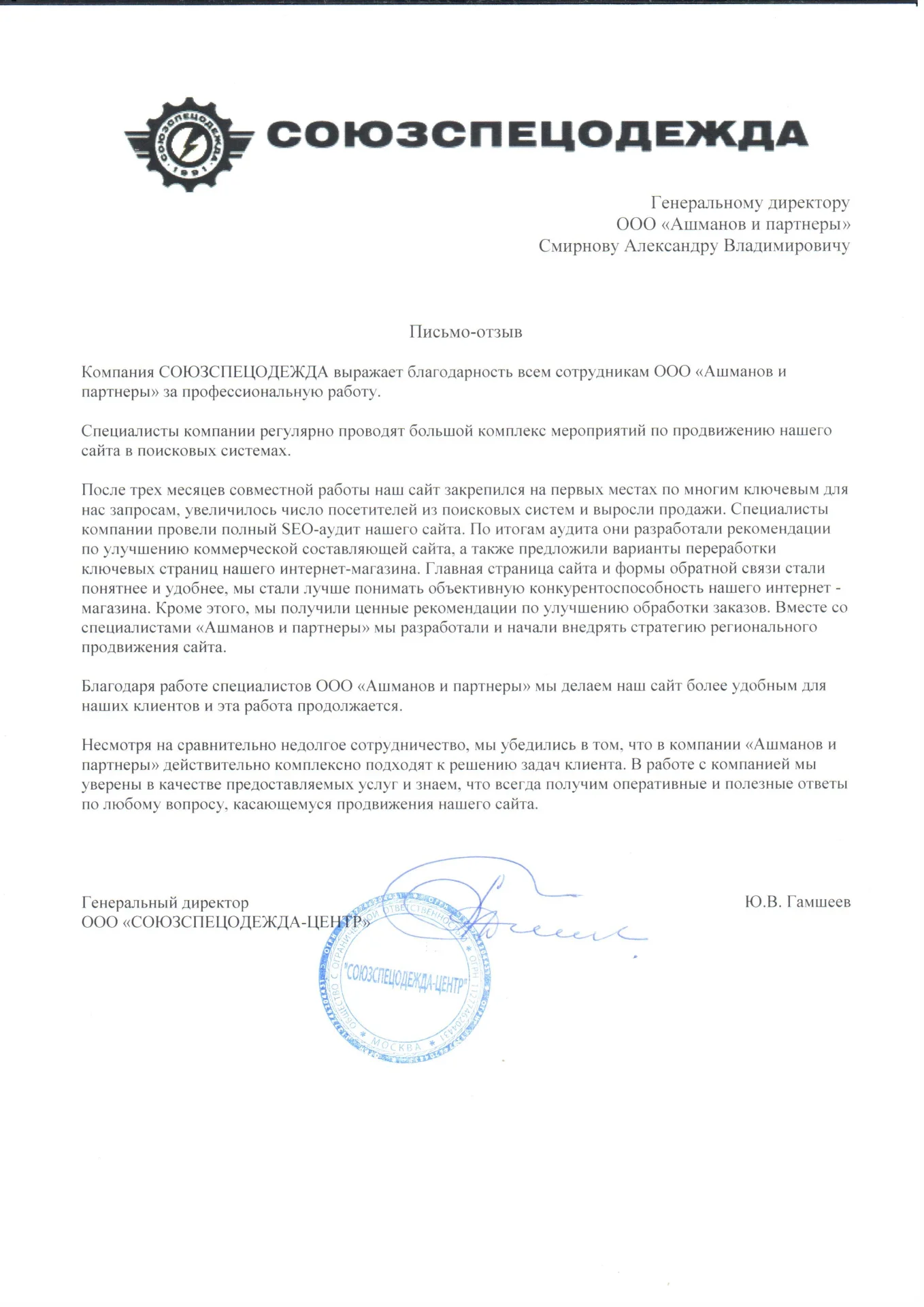 Компания СОЮЗСПЕЦОДЕЖДА выражает благодарность всем сотрудникам ООО «Ашманов и партнеры» за профессиональную работу. После трех месяцев совместной работы мы закрепились на первых местах по многим ключевым для нас запросам, увеличилось число посетителей из поисковых систем и выросли продажи.