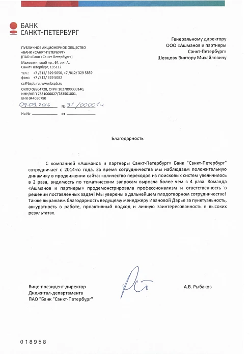 С компанией «Ашманов и партнеры Санкт-Петербург» Банк «Санкт-Петербург» сотрудничает с 2014 года. За время сотрудничества мы наблюдаем положительную динамику в продвижении сайта: количество переходов из поисковых систем увеличилось в 2 раза, видимость по тематическим запросам выросла более чем в 4 раза. Команда «Ашманов и партнеры» продемонстрировала профессионализм и ответственность в решении поставленных задач! Мы уверены в дальнейшем плодотворном сотрудничестве! Также выражаем благодарность ведущему менеджеру Ивановой Дарье за пунктуальность, аккуратность в работе, проактивных подход и личную заинтересованность в высоких результатах.