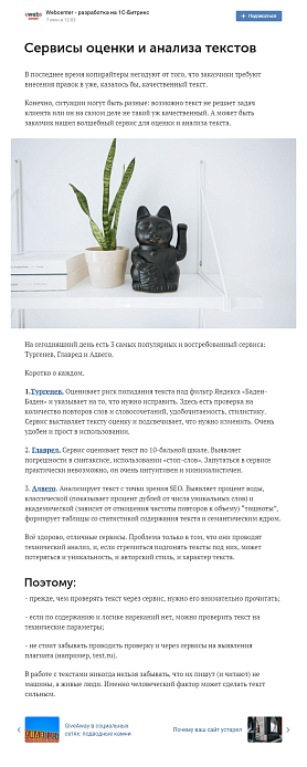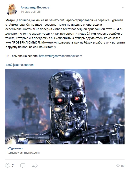 Алёна Зольничкова Я Тургеневым для себя проверяю, хотя по ТЗ нет требований. Со стороны посмотреть на текст. Полезная штука, у меня, например, со стилистикой проблемы оказались.