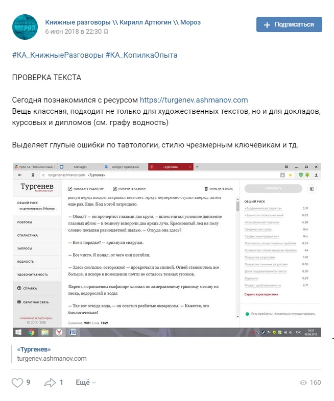 Сегодня познакомился с ресурсом turgenev.ashmanov.com Вещь классная, подходит не только для художественных текстов, но и для докладов, курсовых и дипломов (см. графу... Читать далее
