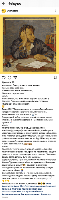 Весной 2017 г. Яндекс начал борьбу с текстами, написанными для поисковых роботов, и внедрил алгоритм «Баден-Баден». Это фильтр Яндекса, который определяет переоптимизированные страницы с некачественными, неестественными текстами и понижает их позиции в выдаче. Понижение в ранжировании может коснуться как отдельной страницы, так и сайта целиком.