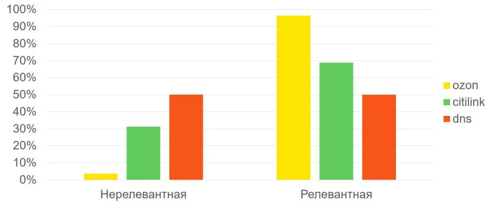 У OZON практически на все запросы были релевантные страницы, их доля составила почти 100%. У Сitilink оказалось примерно 30% страниц нерелевантны. А у DNS доли разделились примерно поровну.