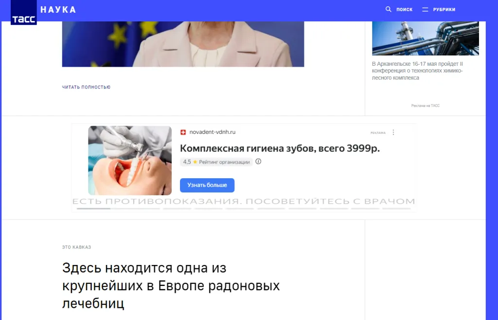 Рекламный баннер на сайте ТАСС в релевантном разделе «Наука»