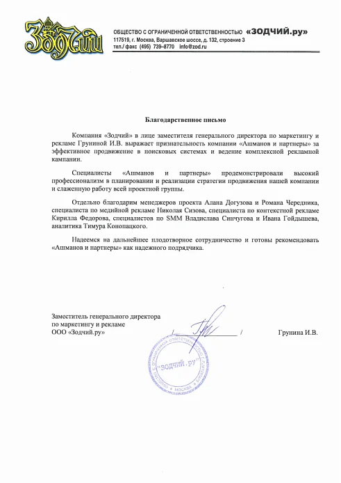 Заместитель генерального директора по маркетингу и рекламе ООО «Зодчий.ру»